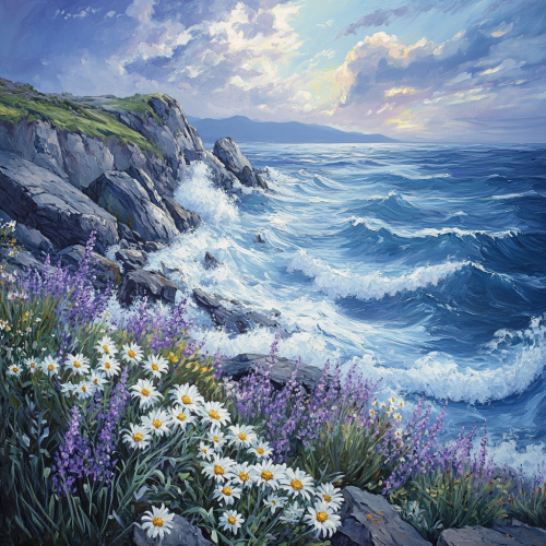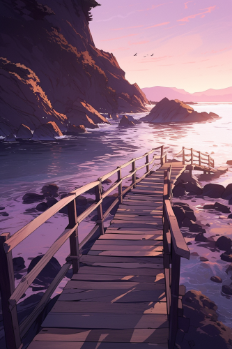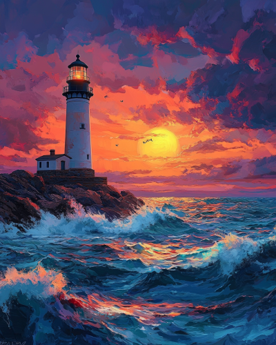 in the style of 2D game graphics A quaint lighthouse stands tall on a rocky coastline, embraced by crashing waves and a colorful sunset sky in the style of Studio Ghibli illustrations, with an anime art style, digital painting, oil paint, high resolution, detailed, concept art, digital art, pixel art, wide-angle cinematic shot, low perspective, side view, fantasy artwork, 2D game graphics, lo-fi aesthetic, pastel colors, hyper-realistic, cinematic, Octane render, Unreal Engine 5. --ar 4:5 --s 500