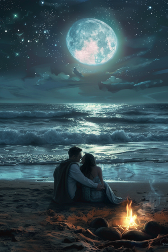 realistic, A couple sitting on the sand near a small bonfire, with the ocean waves softly crashing nearby. The firelight flickers on their faces as they sit close, wrapped in a blanket, watching the stars reflect on the water. The moon is full, casting a soft glow on the tranquil scene --v 6.0 --ar 2:3