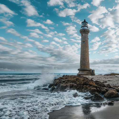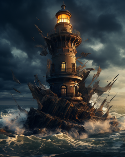 dark futuristic broken lighthouse, neo noir steampunk, highly realitic with waves crashing around it, high quality, highly realistic --ar 4:5 --v 5.2