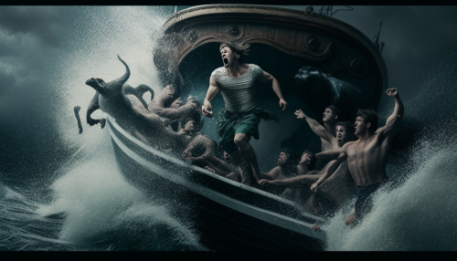 A hyper-realistic, high-definition photo of Jonah being launched through the air, after being thrown by four men into the ocean, from a very large boat from the ancient world, cinematic lighting, jonah must look desperate and petrified. , image is zoomed out to see the ocean and the waves --aspect 16:9 --v 4