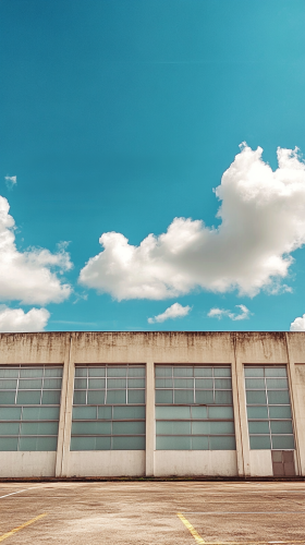 simple retro poster with no strokes and minimal details, of the exterior wall of an industrial building in BARRANQUILLA, COLOMBIA, in the style of Sebastián de la Forêt's design, is minimalist and sleek with large windows. The structure has a flat roof made from concrete panels. There's a parking lot in front under a blue sky with white clouds.The style is inspired by pop art and minimalism design. It has vintage vibe, with simple shapes and flat colors.