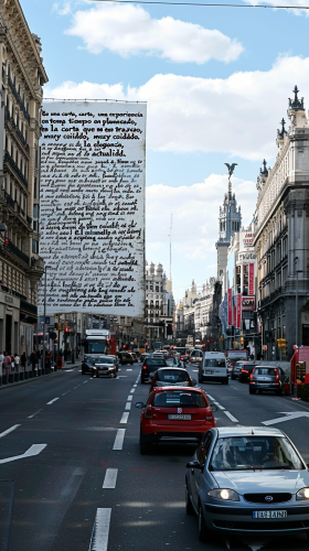 hay un texto pintado en blanco sobre la carretera de la Gran VÃa de Madrid "Cornamusa es una carta, una experiencia que uno toma tiempo en planear, algo Ãntimo, personalizado, muy cuidado. Es la carta que se escribÃa a mano, son esos trazos de la letra manuscrita, es la elegancia, el minimalismo, con toques de actualidad. Es una elaborada sencillez. Algo fácil de disfrutar pero cargado de detalles y de pensamiento" --ar 9:16