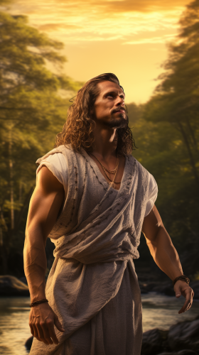HDR ,cinema 4d, ultra-high definition resolution, glowy image, golden hour, 8k,realistic photo, Bible Character, Bible era, 722 BC, A muscular man with middle brown (AaBb)-toned skin, long wavy hair and a full beard, standing in a lush, vibrant forest, towering trees and streams of water, clear and detailed – golden hour, perfect, 3D-rendered, shot in the style of Ansel Adams, captured with a Hasselblad H6D-400c. --ar 9:16 --stylize 150 --v 5.2