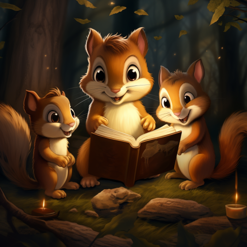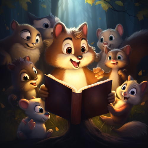 create a cartoon children's book cover of a baby squirrel teaching his animal friends about the Bible, dark forest with glowing Bible
