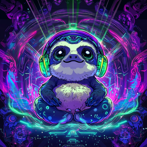 Chibi-style sumo sloth meditating, surrounded by vibrant, futuristic digital patterns and mandala-like structures inspired by *The Animatrix*. The scene features glowing, ethereal light in deep purple and neon green hues, reminiscent of the 'Instructor' visuals. The sloth has a calm, serene expression with large, expressive eyes and is wearing oversized headphones with glowing accents. The sloth is floating slightly above the ground in a sumo pose, exuding a sense of inner peace. Swirling electrical currents in electric blue and violet encircle the sloth, adding a dynamic energy to the scene. The background is a mix of intricate circuitry, spiritual symbols, and radiant energy pulses, creating a harmonious blend of technology and spirituality. The overall aesthetic is cyberpunk, with a soft glow illuminating the scene, capturing the essence of digital enlightenment.
