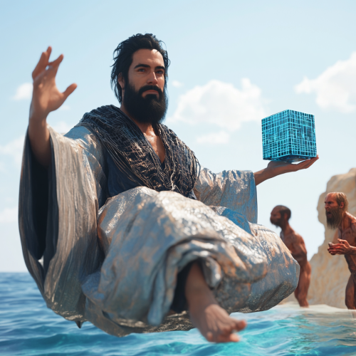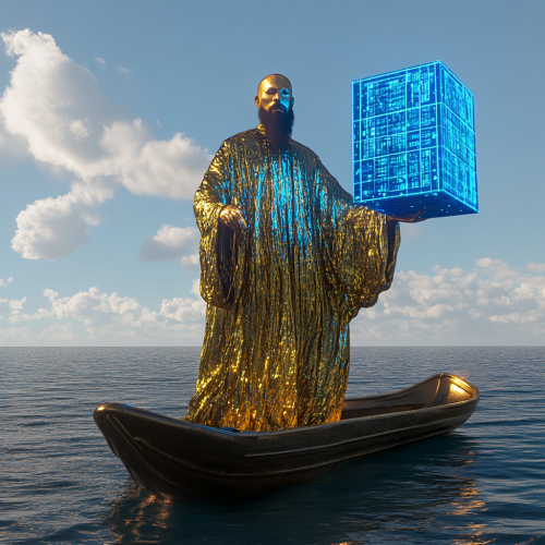 render a bearded man dressed in futuristic cyberpunk style traveling robes. He is riding a large futuristic floating boat over the ocean carrying a small blue cube in his left hand with matrix lettering on all 6 sides. He is approaching a beach with primitive cave men bowing to him.