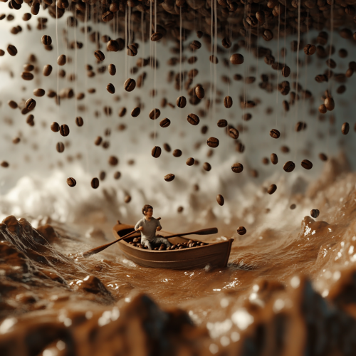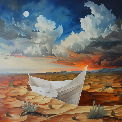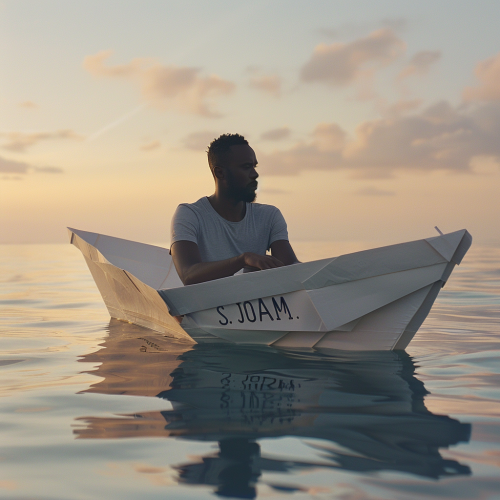 Create a scene featuring a Black man sitting calmly in a small, detailed paper origami boat floating on gentle waters. The boat has the name 'SS. JORAM' written clearly on its side in bold letters. The man is wearing casual clothes, with a peaceful expression, as he enjoys the tranquil atmosphere. The sky is soft with pastel hues during sunrise or sunset, and the reflection of the boat can be seen in the water. The overall scene should feel whimsical, serene, and imaginative, with a slight surrealistic touch to emphasize the paper boat concept. --v 6.0