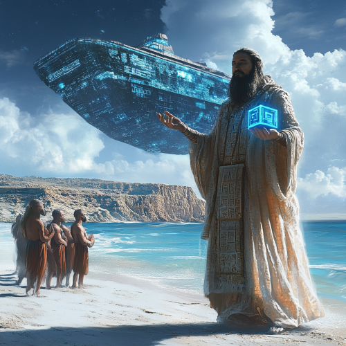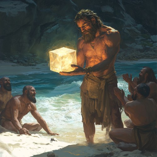 render a tall bearded man dressed in futuristic cyberpunk style traveling robes. He is riding a large futuristic floating ship over the ocean carrying a small blue cube in his left hand with matrix lettering on all 6 sides. He is approaching a beach with cave men bowing to him