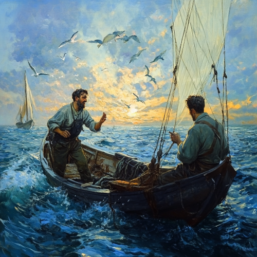 изобрази море, лодку, на лодке прыгающий в море мужчина казах. В море возле лодки проплывает большая рыба. В лодкп двое мужчин смотрят на уплывющую рыбу в рукахту них удочки. В стиле фотореализма, свет воды темноватый в небе летают чайки и другие птици. Вдали виден берег покрытвй зеленным камышем