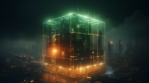 giant floating cyber cube in the middle of a cyber city at night, radiating dark green light creating fog around itself, also some orange ambient light from the night city lights creates an interesting cinematic lighting, --ar 16:9 --v 5.0