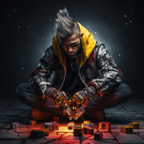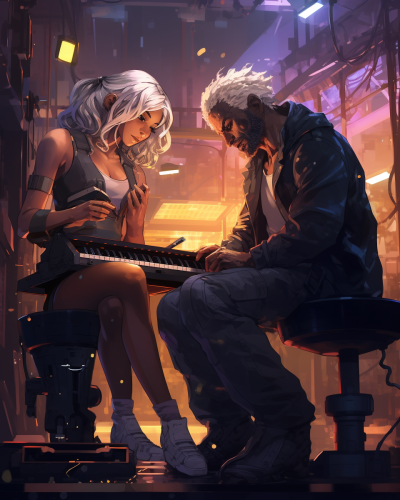 a cyberpunk dream team consists of a girl with a black skirt siting and playing the piano - a manly solider - a girl spinning a basketball - a man with a rubiks cube - a master of puppets controling them all with strings - a wise old man - cyberpunk style --ar 4:5