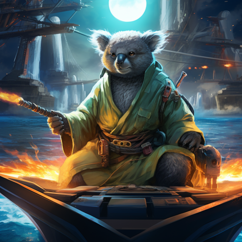 Jedi Koala with light saber meditating on a cyberpunk boat hyperdetailed