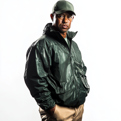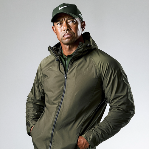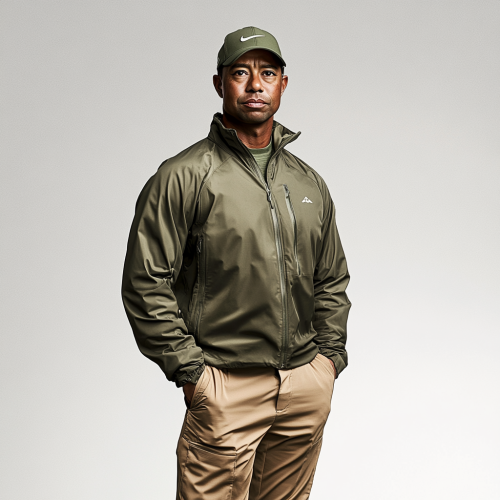 Make a hyper realistic photo of tiger woods wearing luxury sports wear. Make him in a studio with a white background. Make the clothing dark green, and tan pants. Make the colors nuetral. Make him wearing a golf rain jacket. Make clothes similar to travis mathews and arc'teryx. Do not use a logo.