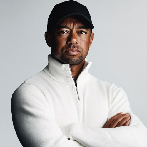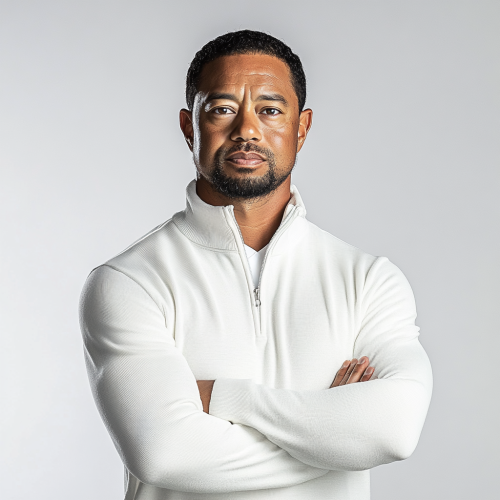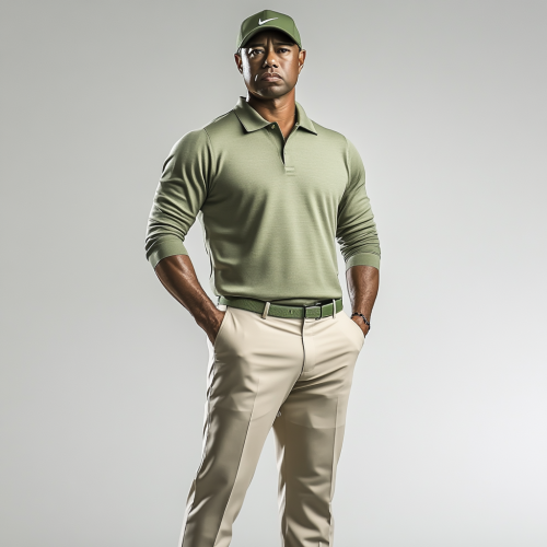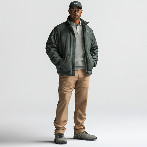 Make a hyper realistic photo of tiger woods wearing luxury sports wear. Make him in a studio with a white background. Make the clothing dark green, and tan pants. Make the colors nuetral. Make him wearing a golf jacket. Make clothes similar to travis mathews and arc'teryx. Do not use a logo