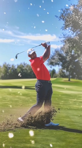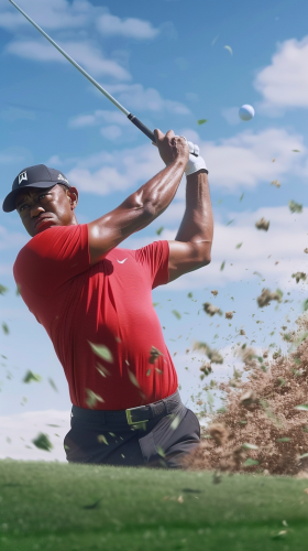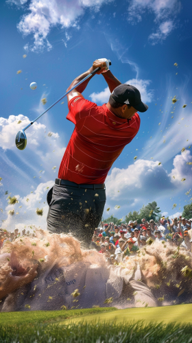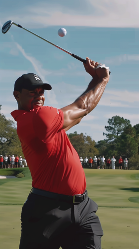 Create a high-energy TikTok-style video of Tiger Woods hitting a perfect flop shot on a sunny golf course. Show Tiger in his iconic red shirt, intensely focused, as he gracefully swings the club. Capture the ball soaring high with a slow-motion arc, landing softly near the pin on a lush green. Include close-ups of the crowd's reactions and the precise moment the ball lands, with dramatic music or sound effects to heighten the tension --ar 9:16 --v 6.0
