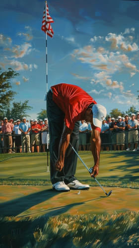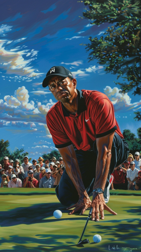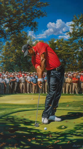 Visualize Tiger Woods near the green, he executes a precise flop shot. He’s wearing his signature red shirt and black cap, with a large, enthusiastic crowd in the background watching closely. The golf ball is caught mid-air in a graceful arc, hovering just above the green anticipation as the ball approaches the hole --v 6.0
