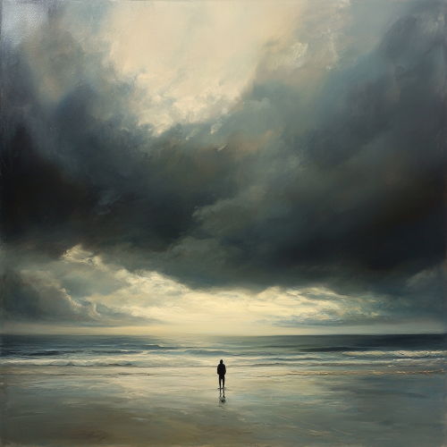 Wide shot of a person on an empty beach at dawn, looking out into the endless ocean. Their figure is small against the vastness, with dark clouds overhead and waves crashing. Impressionist style, soft brushstrokes capturing the loneliness of the moment. --s 50 --style raw