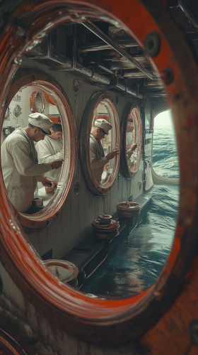 An ultrarealistic photograph, mermaid has been caught in a photo by a group of fishermen on the sea, they follow the 12ft mermaid in their boat, the mermaid is a mutant creature with puffy blue human lips, bulging red eyes, a pale face and a scaly body, we can only see it's scaly fish like back in the water, photo shot by a journalist --ar 3:4