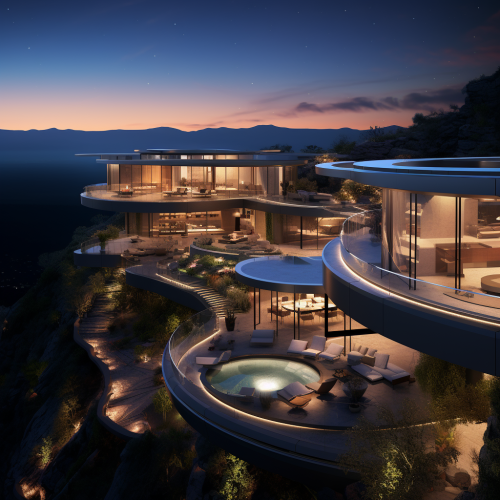 Architectural marvel, vast estate, panoramic vista, seamless integration, textured facade, Richard Neutra-inspired, SANAA architects' futuristic visions, meticulously designed, Feng Shui harmony, heart of the mountains, elite sanctuary elegance, colorful backdrop of nature.