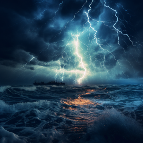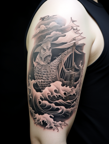 create a ready to print black & grey tattoo design of an asian koi fish swimming in a turbulent sea underneath a battered sailing ship --ar 3:4