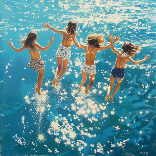 Four girls jumping into the blue sea, the backside, the French Sea of Nice, the sky blue sea, and the vast sea are shining in the sunlight.