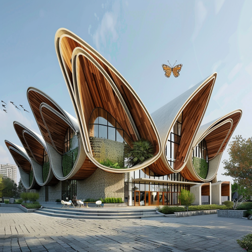 Create butterfly-inspired organic high school In Punjab india. Imagine a central, chrysalis-shaped building with wing-like structures made of wood and stone, flowing outwards and upwards. Incorporate skylights, living walls, and rooftop gardens. Design playful, flowing interiors with butterfly motifs and promote movement with open spaces. Capture the essence of transformation and nature throughout the design.art style realistic architecture 8k image