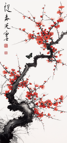 The butterfly stands on the branch of blooming plum blossoms, vibrant and brightly colored, in the Chinese literati style, reminiscent of Qi Baishi's artistic style. It exudes poetic beauty with its bold brush strokes against a white background. --ar 9:19 --niji 6 --style raw