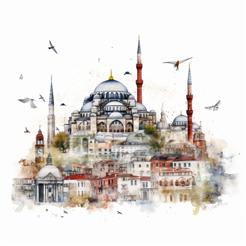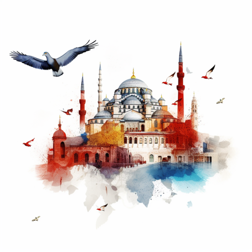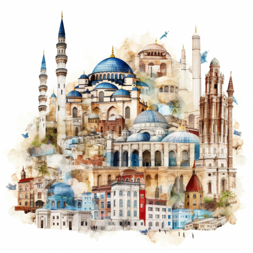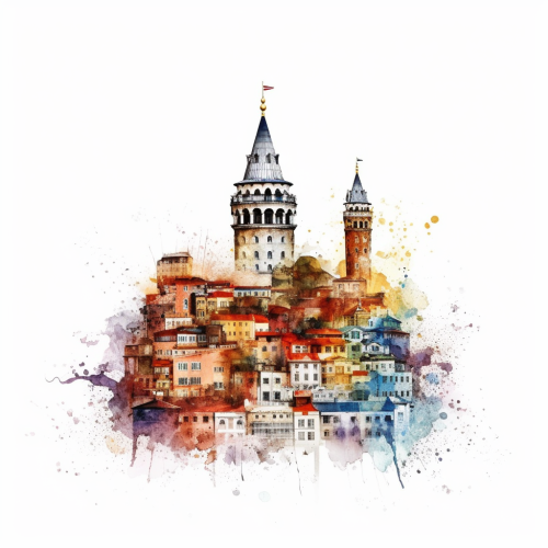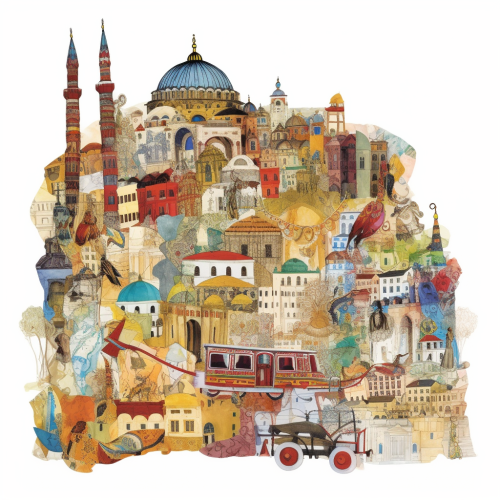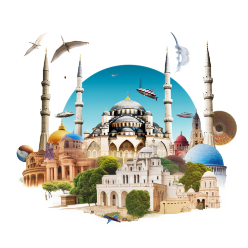 Create a collage of famous tourist attractions in Turkey on a white background. galata tower artistically blend these landmarks, maintaining a harmonious balance of colors and scales. --v 5.0