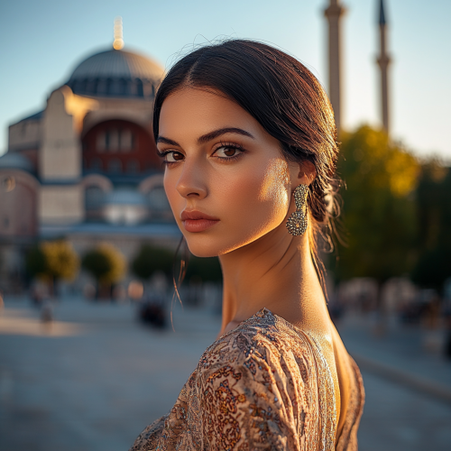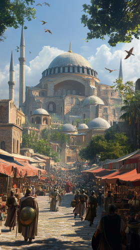 15. The Eastern Roman Empire continued to exist, an image of the Hagia Sophia in its full glory, 6th century AD, Byzantine architecture with a large dome and minarets, Constantinople, bustling markets and traders in the square in the background, wide shot capturing the grandeur of the empire, hyper-realistic, photo realism, cinematography --ar 9:16