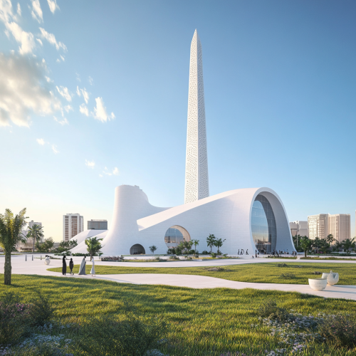 A white mosque with an obelisk in the center, designed by snohetta as seen on archdaily and pixar style rendering, located at Al turns road abu dhabi , next to it is a large grassy field with people walking around, the sky above is blue with few clouds, the background features buildings of alaez city. The overall architectural design should be minimalist yet elegant, reflecting contemporary architecture and modern urban aesthetics.