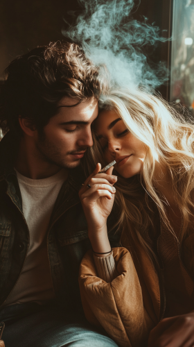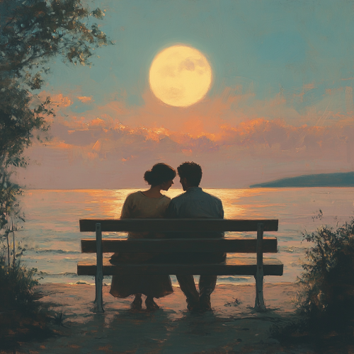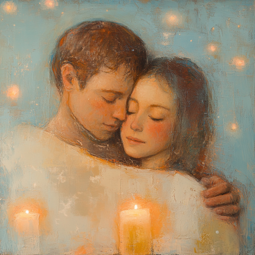 A tender and intimate scene that captures the essence of companionship and support. The setting could be a cozy, serene environment like a peaceful park bench at sunset, a quiet beach with two figures sitting close together, or a softly lit room where two people are sharing a comforting moment. The central focus is on figures side by side, engaged in a supportive or affectionate gesture, such as sitting closely, holding hands, or leaning on each other. The background features warm, soothing colors like soft blues, gentle pinks, and warm grays to enhance the feeling of closeness and comfort. Subtle details like soft light glows, gentle textures, or shared personal items add to the sense of togetherness and support. The overall mood is warm and reassuring, capturing the essence of being there for someone and sharing a close bond.