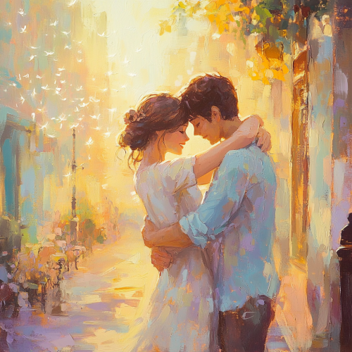 A tender and emotional scene capturing the moment of reunion between two figures. The setting is a meaningful, intimate location, such as a cozy park or a familiar street corner, where the figures are finally coming together. They are shown in a heartfelt embrace or joyful interaction, with expressions of relief and happiness. The background features soft, warm lighting, perhaps with a sunset or gentle rays of sunlight, creating an atmosphere of warmth and anticipation. The color palette includes soft, warm tones like golden yellows, pastel pinks, and gentle blues. Subtle details such as flying dandelion seeds or gently falling leaves add to the sense of a hopeful, significant moment. The overall mood is emotionally uplifting and celebratory, emphasizing the joy and connection of reuniting soon.