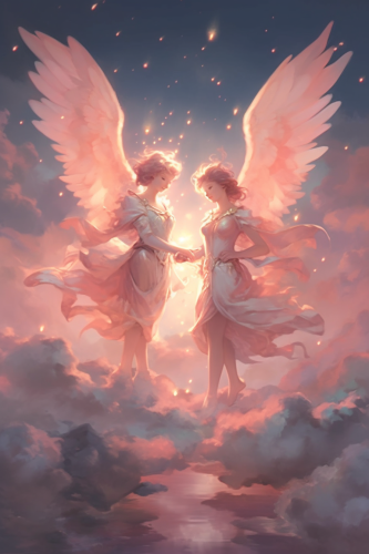 the following background for a scenario: Glam Fantasy blends with Renaissance elegance. In this visual narrative lies the concept of divine connection, two halves of the same soul that split into two bodies. The aesthetic is represented by a cosmos sky paradise, decorated with rich textures and soft colors like light pink, lavender, and powder blue, creating a dreamy atmosphere.