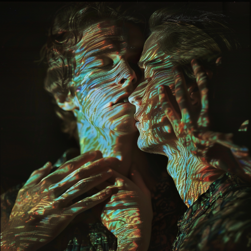 A photoelasticity image of a couple in an intimate pose. The man has his hands on the other man's face, and he has his hands on his shoulders. Both have their eyes closed. The background is dark. The image contains a variety of color bands and patterns, indicating stress distribution within the transparent material. --v 6.0