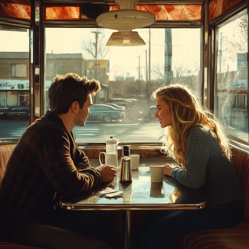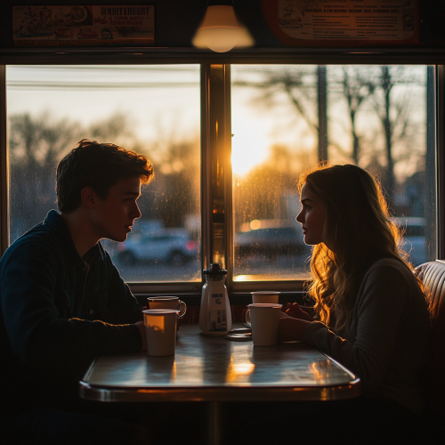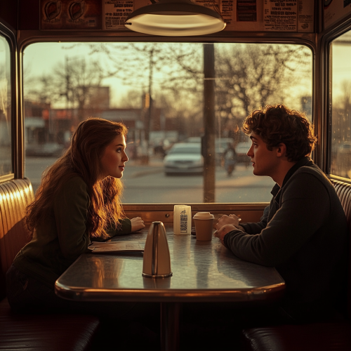 image capturing an intimate moment between two people, a young man and a young woman, sitting across from each other in a cozy booth at a classic diner. The lighting in the scene is warm and soft, likely from the early morning sun streaming through the large windows behind them, creating a gentle, nostalgic glow. The couple is engaged in conversation, their faces lit by the natural light, adding to the sense of connection between them. They both have coffee cups in front of them, and the table holds a few simple items like a sugar container and a napkin dispenser, emphasizing the unpretentious, everyday setting. The diner itself has a retro feel, with a polished metal-edged table and upholstered seats. The background outside the window shows a parking lot with a few cars, and some indistinct buildings, likely in a suburban or small-town setting. The overall atmosphere of the image is one of quiet, reflective intimacy, capturing a candid moment of connection in a timeless, familiar setting. The lighting and composition create a serene and nostalgic mood, emphasizing the simplicity and depth of the interaction between the two individuals.