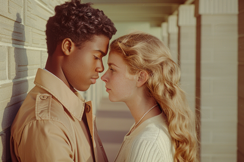 realistic high quality photo of A romantic and intimate scene with a young couple standing close, facing each other, both in profile. The man is wearing a beige trenchcoat and silver chains, has short black curly hair, while the woman has long, blond hair flowing loosely. Their faces are softly lit, with gentle expressions as they share a deep, emotional connection. The background is blurred and dreamy, with soft pastel tones creating an ethereal atmosphere. The overall mood is calm, serene, and tender, with a mix of warm and cool lighting.. minimalistic, a bit blurred, soft colors, dreamy mood, emotional feeling, ethereal --sref 3840558885 --style raw --ar 3:2 --v 6.0 --s 250