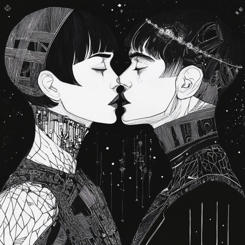 Create an Edward Gorey-style illustration portraying two figures locked in a close, intimate moment. Both characters wear futuristic outfits adorned with geometric patterns and metallic accents, with reflective surfaces that catch fragmented light. Use intricate cross-hatching to emphasize texture and depth, carefully illustrating the folds and details of their clothing. Their faces remain expressionless, embodying emotional detachment and mystery. The background should be minimal, with faint glowing shapes or lines suggesting a surreal, dream-like setting. Incorporate subtle symbolic motifs, such as abstract patterns or small mechanical elements, hinting at deeper layers of meaning. The overall atmosphere should balance elegance and eeriness, capturing the quiet tension and otherworldly charm characteristic of Gorey’s artwork.