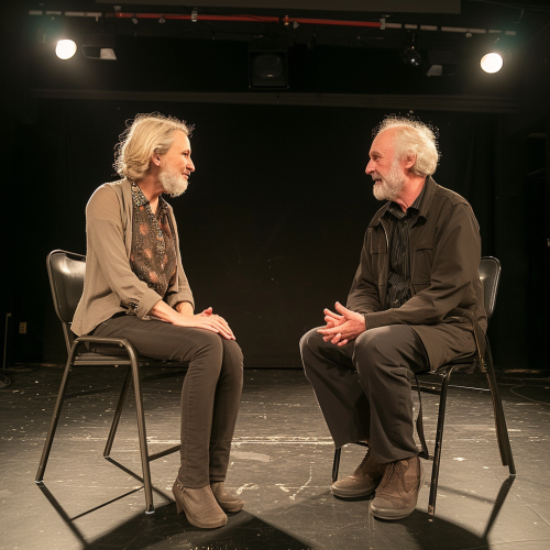 two people in conversation. a mature man and a mature woman. they are in the setting in this photograph. on a small stage. in a small theater. there's an early 1970's vibe.. its an interview. manhattan. like where a small theatre group would rehearse. causual . a woman is the interviewer. she looks like christiane amanpour. the man is the interviewee. he looks like harrison ford. the lighting focuses on the two people the back of the stage is in shadows. the camera is facing the two people. hyperrealistic. --v 6.0
