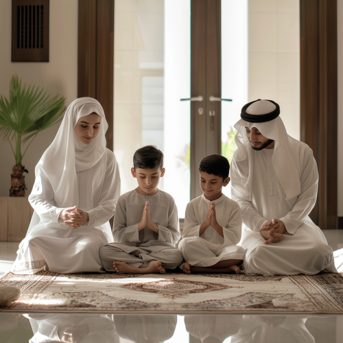 A family in a house wearing white Islamic clothes praying to God , real , 8k --style raw