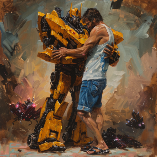 Jesus in blue Jean shorts and crocs embraces rodimus prime transformer