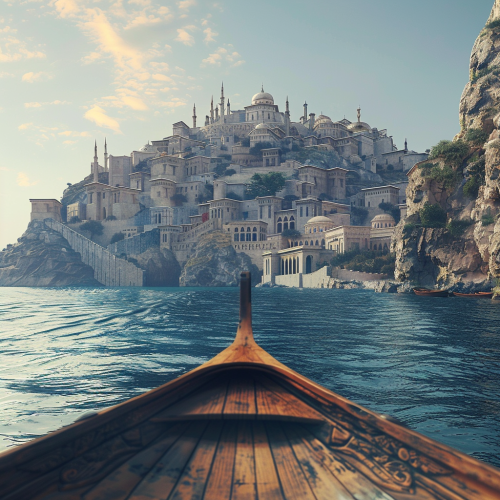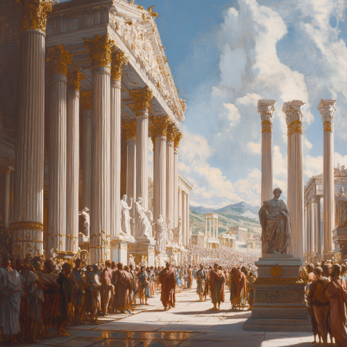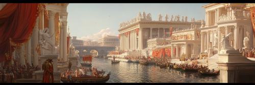 An oil painting of the Roman Empire's palace in ancient Rome, with white marble columns and gold accents, decorated with Greek statues on plinths around it. In front is an enormous building adorned with red satin drapery, surrounded by small boats with people wearing elaborate costumes. The sky above should be light blue, and there should also be some water visible. This scene conveys grandeur and opulence typical of classical architecture, reminiscent of the style of Thomas Cole. --ar 3:1