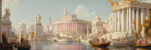 An oil painting of the Roman Empire's palace in ancient Rome, with white marble columns and gold accents, decorated with Greek statues on plinths around it. In front is an enormous building adorned with pink satin drapery, surrounded by small boats with people wearing elaborate costumes. The sky above should be light blue, and there should also be some water visible. This scene conveys grandeur and opulence typical of classical architecture, reminiscent of the style of Thomas Cole. --ar 3:1