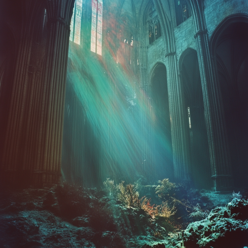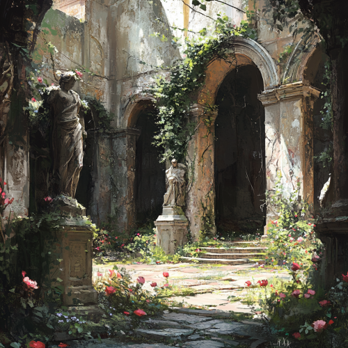 An overgrown garden hidden within the ruins of an old mansion, with wildflowers blooming among broken statues, vines creeping over crumbling walls, and a sense of forgotten beauty, 1:1 --v 6.1
