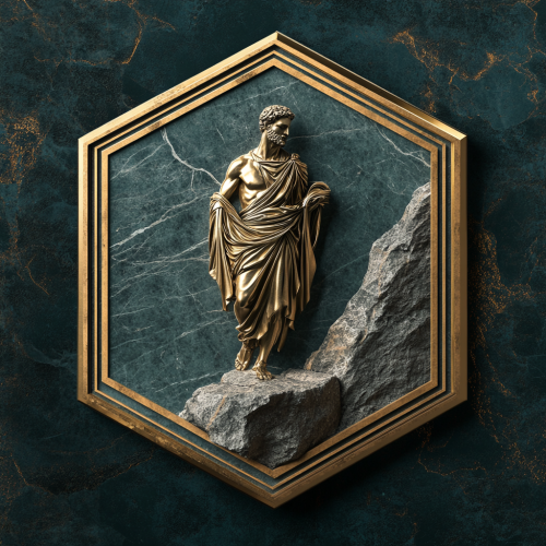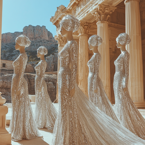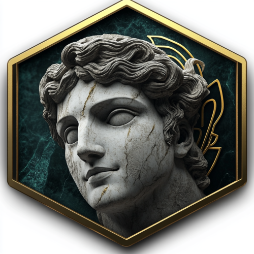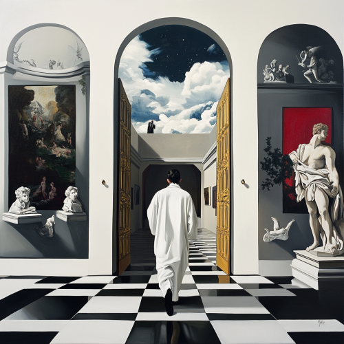 Figure in white robes walking into Heaven’s gold gates doors centered. Leading into the sky. Checkered floor, paintings and Greek statues. Beautiful fever dream. Epic album cover art --v 6.1 --sref 2120725833