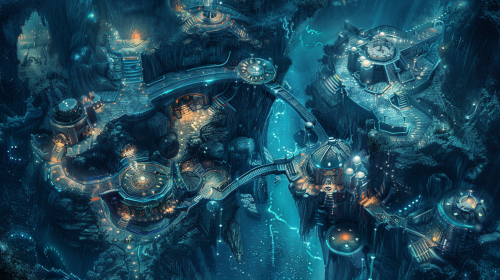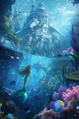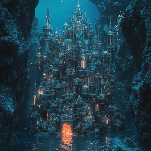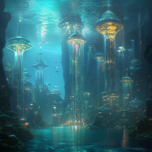 Design a futuristic city based on the legendary Atlantis. The city is submerged beneath the ocean, with transparent domes and towering spires made of crystalline materials. Coral reefs and bioluminescent sea creatures light the way between the structures. The buildings are adorned with ancient Atlantean symbols, glowing softly in the deep sea. The city is self-sustaining, with advanced aquatic technology harnessing tidal and geothermal energy. High-tech submarines and sleek underwater vehicles glide past, while advanced marine life forms interact with the city’s inhabitants