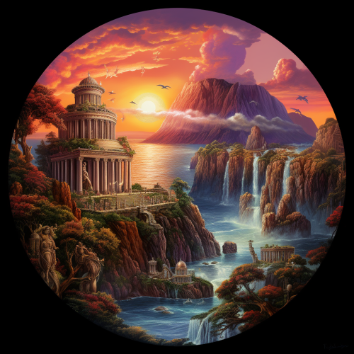 Atlantis on a clifftop with garden and waterfall, coastline, Plato and athena gold statues, terracotta greek temples, rotunda, silver ufo in sky, orange pink sunset, attractive, mysterious