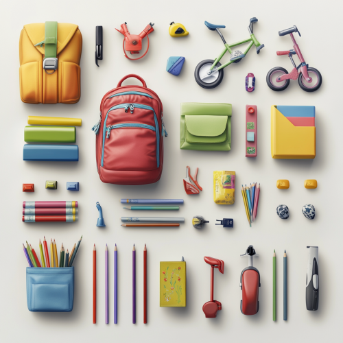Create a realistic image featuring all the products sold in a children's stationery and toy store. Arrange the items as a package or bundle in the center of the image, neatly stacked or grouped together. Include one item from each category: a colorful backpack, a notebook, pencils, a bicycle, a scooter, a toy car, children's books, art supplies (paintbrushes, colored pencils), and small gift boxes. The background should be clean and simple white, with minimal distractions, and the products should appear vibrant and realistic, positioned closely together as one cohesive bundle