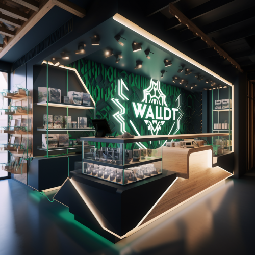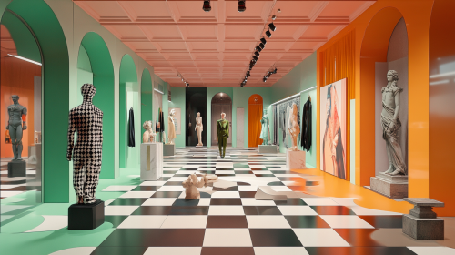 3D rendering, design of a pop-up store for the perfume brand, artistic installation with three rooms where each room has a theme: the first is a giant chessboard with minty green as the dominant color, the second room is an art studio with statues and paintings with orange as the dominant color, and the third room is a theater piece with red as the dominant color by Kengo Kuma --ar 16:9