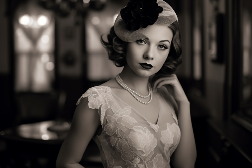 1930's Glamour: Captured on a Canon EOS 5D Mark IV, 50mm lens, this black & white image exudes vintage elegance. A 1930s female influencer poses confidently, her attire and accessories reflecting the era's unique style. Settings: f/1.8, ISO 100, 1/200 sec. --ar 3:2