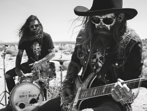 two guitar players in a metal band with a bass player and a drummer. All sitting out in the desert for a black and white photo bright cinema, art station --ar 4:3 --q 2 --style raw